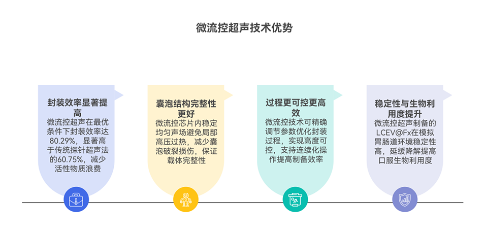 2、微流控超声技术经模拟与实验验证,能产生稳定均匀的声压场,优化能量输入,减少囊泡结构损伤,提升包封效率。