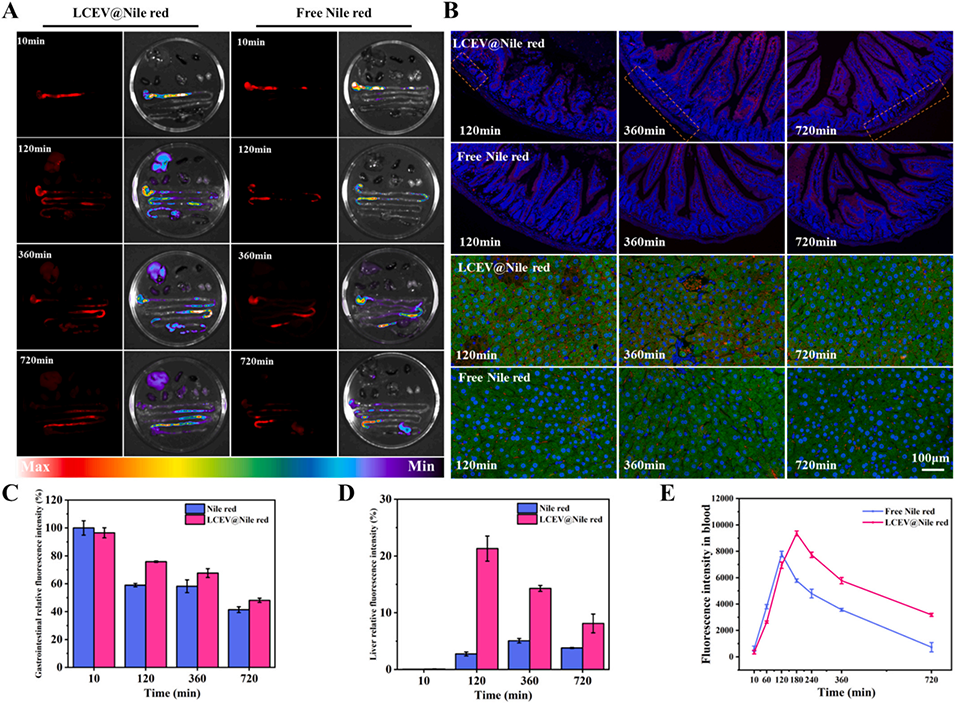 图5. LCEV@尼罗红与游离尼罗红在小鼠体内的生物分布与代谢。(A)不同时间点 LCEV@尼罗红与游离尼罗红在小鼠主要器官中的分布;(B)小鼠口服 LCEV@尼罗红或游离尼罗红后,肠道与肝脏组织的共聚焦显微镜图像;(C)不同时间点小鼠胃肠道内的荧光强度分析;(D)不同时间点小鼠肝脏内的荧光强度分析;(E)不同时间点小鼠血液中的荧光强度分析。