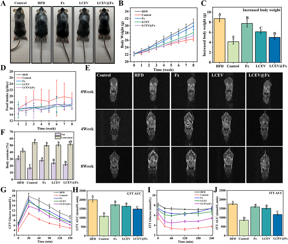 图8. LCEV@Fx 对高脂饮食(HFD)喂养小鼠体重、体脂含量及代谢的影响。(A)小鼠代表性外观图像;(B)体重变化;(C)体重增量;(D)食物摄入量;(E)磁共振成像(MRI)图像;(F)体脂与瘦体重比值分析;(G)葡萄糖耐量试验(GTT)过程中的血糖变化;(H)GTT 曲线下面积;(I)胰岛素耐量试验(ITT)过程中的胰岛素敏感性;(J)ITT 曲线下面积(8 周实验期间不同处理组小鼠数据)。不同字母表示差异显著(p<0.05)。