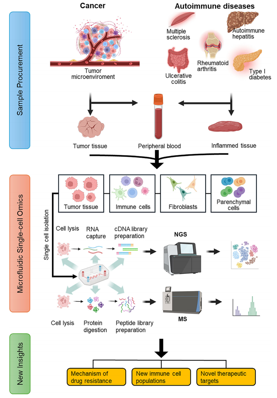 图1. 微流控介导的单细胞组学在癌症与自身免疫性疾病免疫治疗中的应用。首先从患者体内采集病变组织或血液样本;随后通过组织解离或血液处理试剂盒获得单细胞悬液;单细胞转录组、蛋白质组及分泌组的提取可在微流控平台上完成;借助最先进的下一代测序(NGS)和质谱(MS)技术,可进一步开展多组学分析。这一流程有助于更深入地揭示疾病病理机制、识别新型免疫细胞群体,并发现新的治疗靶点。