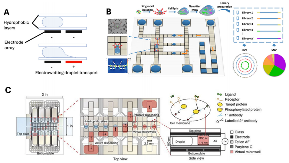 图2. 用于单细胞组学研究的数字微流控(DMF)技术。(A)介电湿润与液滴传输示意图:液滴被两层内嵌电极阵列的疏水表面包裹;当向邻近电极网格施加正电压时,表面局部亲水性发生改变,从而牵引液滴向带电网格移动。(B)数字微流控用于单细胞全基因组测序的示意图:单细胞分离、细胞裂解及 DNA 捕获等步骤均可在 DMF 平台上完成。(C)数字微流控用于单细胞蛋白质检测的示意图:该技术依托微型化荧光免疫分析方法,实现对蛋白质磷酸化水平的监测。