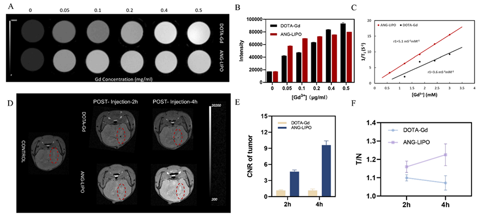 图3.(A)不同浓度的 BPA-F&DOTA-Gd@LIPO-ANG 与 DOTA-Gd 水溶液的 T1 加权磁共振成像(MRI)图;(B)T1 成像信号强度统计结果;(C)各制剂的水质子纵向弛豫率(1/T1)与钆浓度的关系及弛豫率计算结果;(D)GL261 原位胶质瘤荷瘤小鼠静脉注射 BPA-F&DOTA-Gd@LIPO-ANG 与 DOTA-Gd 水溶液后的 T1 加权磁共振成像图;(E)T1 成像对比度噪声比(CNR)统计结果;(F)肿瘤与周围正常脑组织的信号强度比(T/N)。