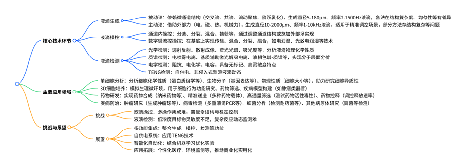 1、系统综述了液滴的生成、操控与检测方法,包括被动与主动生成策略、多种物理场操控技术,以及光学、质谱、电学和基于摩擦纳米发电机(TENG)的检测手段。
