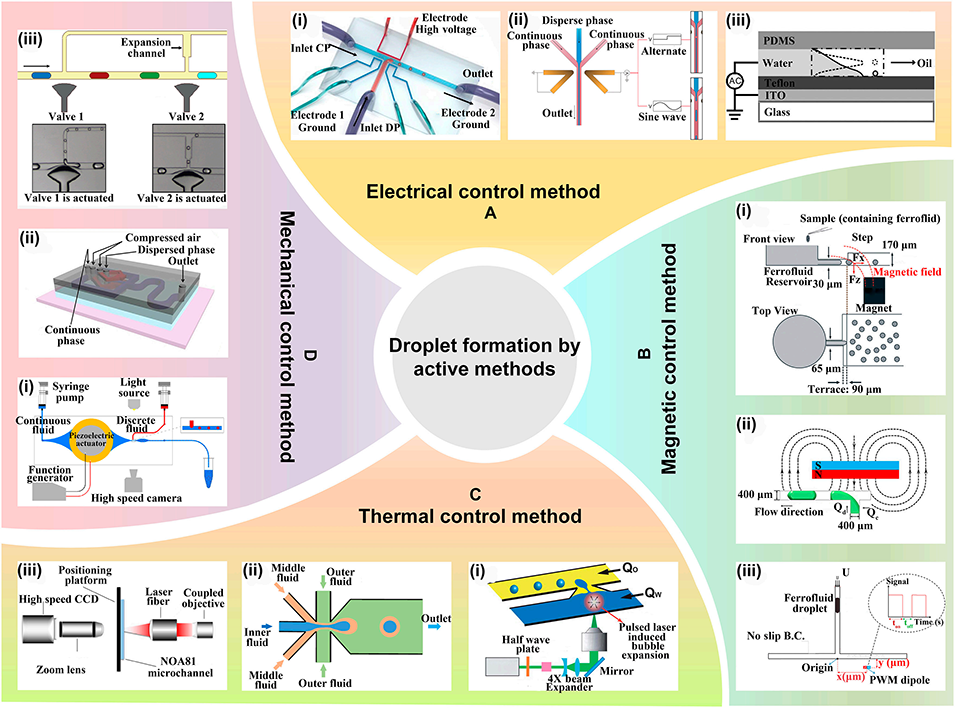 图3: 主动生成方法。展示了利用外部场主动控制液滴生成的方法:A. 电控:通过施加电场或采用电润湿效应控制液滴生成。B. 磁控:利用磁场操控铁磁流体形成液滴。C. 热控:通过激光脉冲或热电冷却器改变温度,影响流体属性以控制生成。D. 机械控制:使用压电驱动器、气动膜阀等机械部件按需生成液滴。
