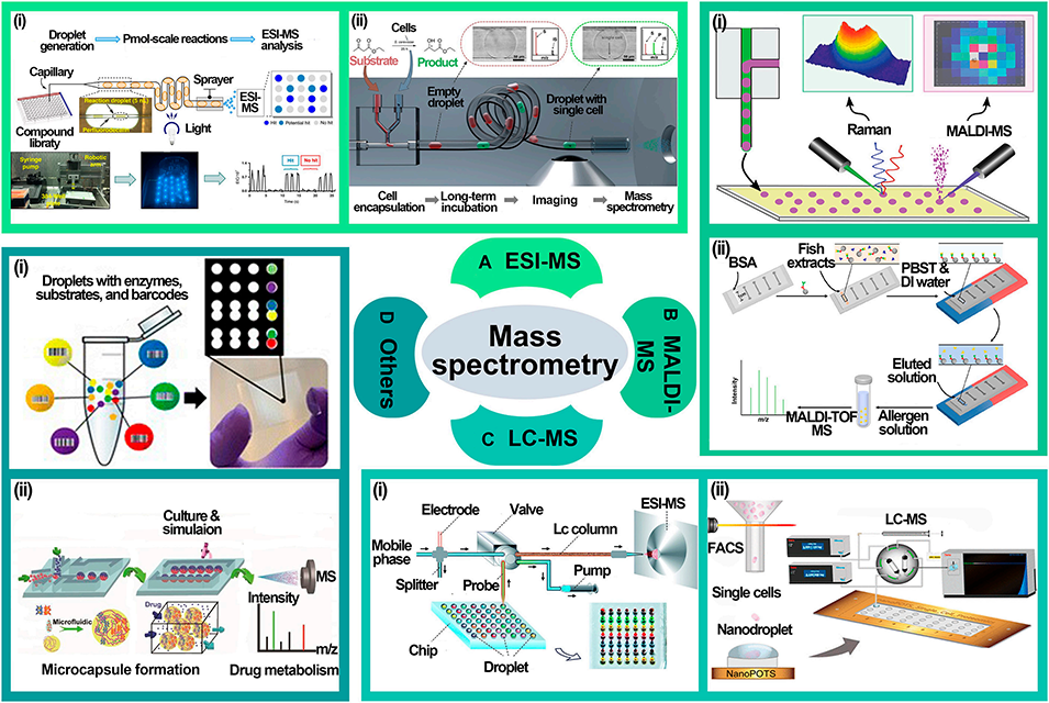 图7: 质谱检测方法。展示了与质谱联用的技术:A. ESI-MS:用于液滴中光化学反应产物、单细胞生物催化转化的高通量分析。B. MALDI-MS:用于神经递质、过敏原等分子的分析。C. LC-MS:用于复杂样品的无标记酶抑制分析、单细胞蛋白质组学。D. 其他质谱方法:如ICP-MS用于单细胞金属元素分析,NIMS用于酶反应筛选。