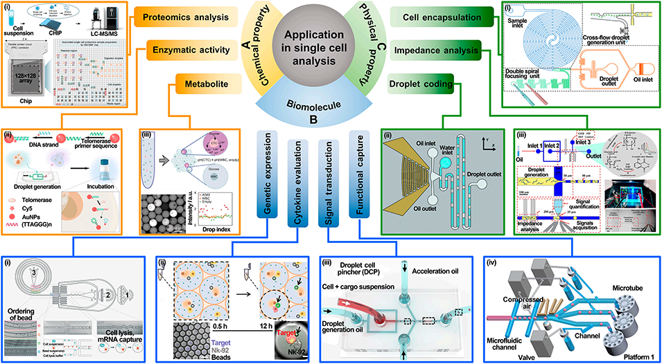 图10: 在单细胞分析中的应用。A. 化学特性:分析单细胞蛋白质组、酶活性(如端粒酶)、代谢物。B. 生物分子:进行单细胞RNA测序、细胞因子释放分析、CRISPR基因递送。C. 物理特性:实现细胞封装、液滴编码、通过阻抗分析测量细胞物理属性。