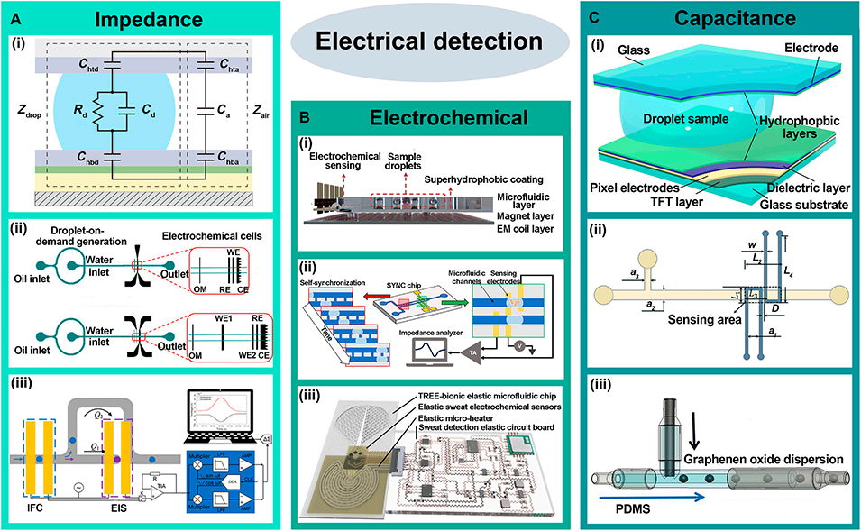 图8: 电学检测方法。总结了基于电信号的检测技术:A. 阻抗检测:用于分析液滴大小、组成和单细胞电特性。B. 电化学检测:用于检测细菌代谢活性、汗液成分等。C. 电容检测:通过测量介电常数变化来监测液滴动态参数。