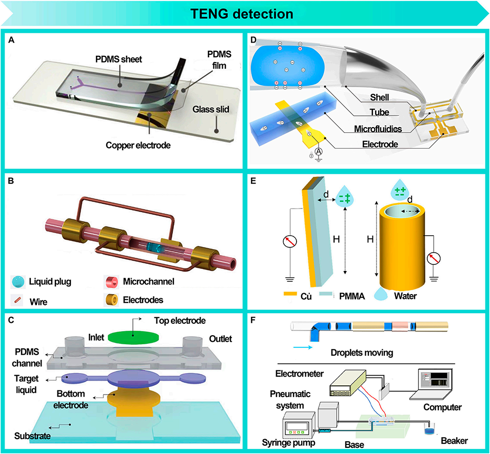 图9: TENG检测方法。展示了基于摩擦纳米发电机的自供能、非侵入式检测技术,能够通过液滴运动产生的电信号实时监测液滴的生成频率、长度、速度、类型和浓度等参数。