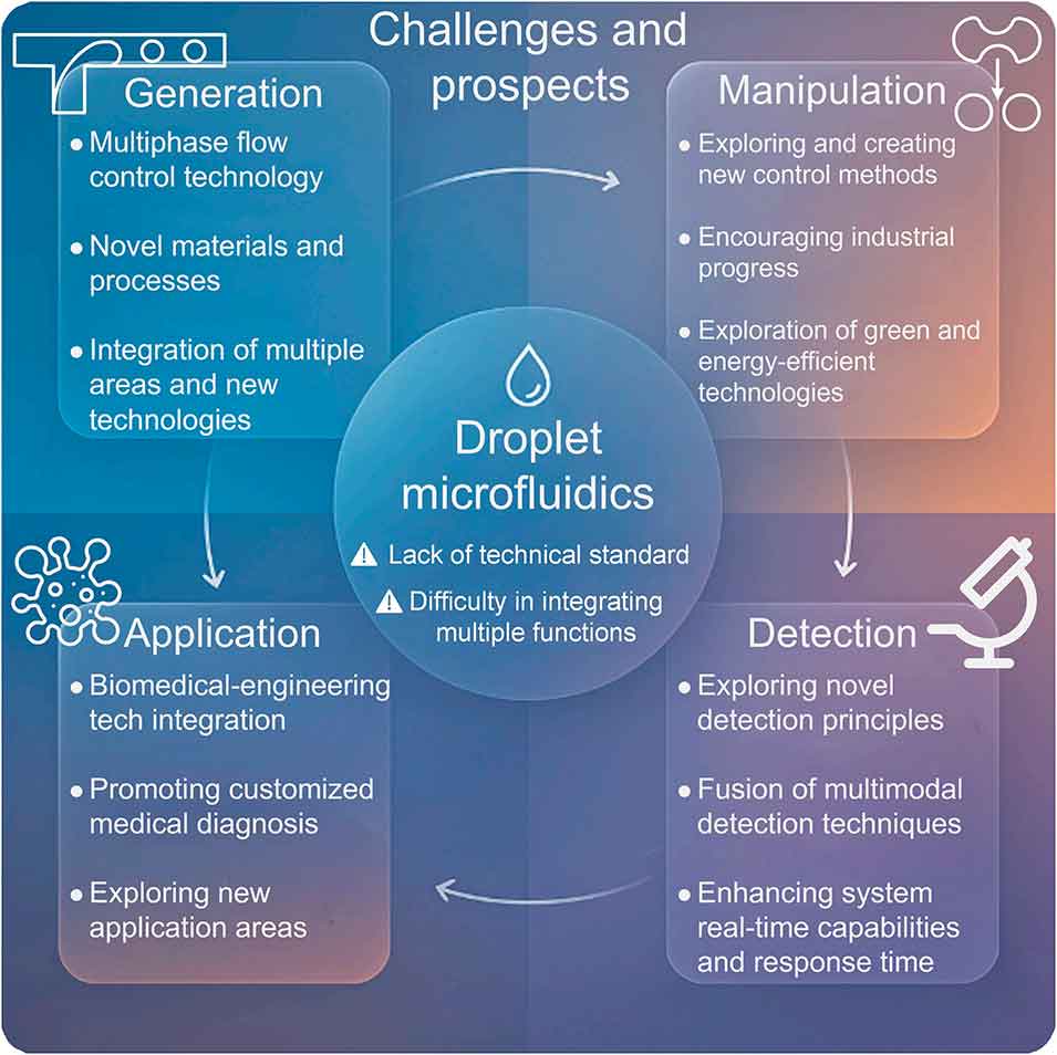 图14: 挑战与展望。该图总结了液滴微流控技术面临的挑战(如多功能集成困难、检测灵敏度与实时性不足)和未来的发展前景(如多功能集成、自驱动系统、智能化与自动化、应用领域拓展)。