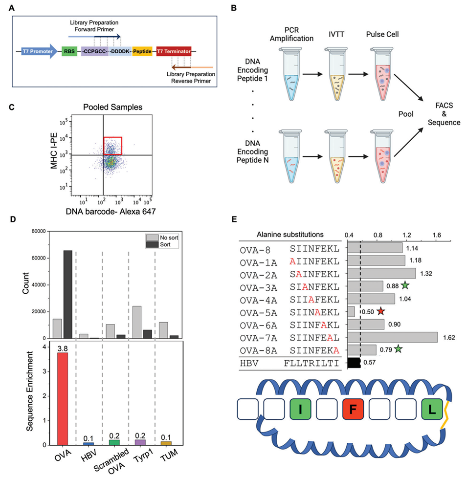 图3. 从 DNA 条形码 APCs 中筛选高亲和力肽段。A)用于从细胞中扩增 DNA 条形码的引物设计图。B)将多组负载肽段的 DNA 条形码 APC 库混合,通过 FACS 分选获得 MHC 高表达的细胞群体。对分选细胞的 DNA 条形码进行二代测序,可筛选出与 APCs 高亲和力结合的肽段序列。C)混合样本中 MHC 高表达的 APCs 亚群。D)分选前后 APC 库中各肽段序列对应的测序读长数。OVA 肽的富集率显著更高,验证其与 H-2Kb 分子的高亲和力。E)在 DNA 条形码 APCs 上进行 OVA 肽丙氨酸扫描的结果。第 5 位苯丙氨酸(F)、第 8 位亮氨酸(L)和第 3 位异亮氨酸(I)的替换会导致肽段与 MHC 分子的亲和力下降。