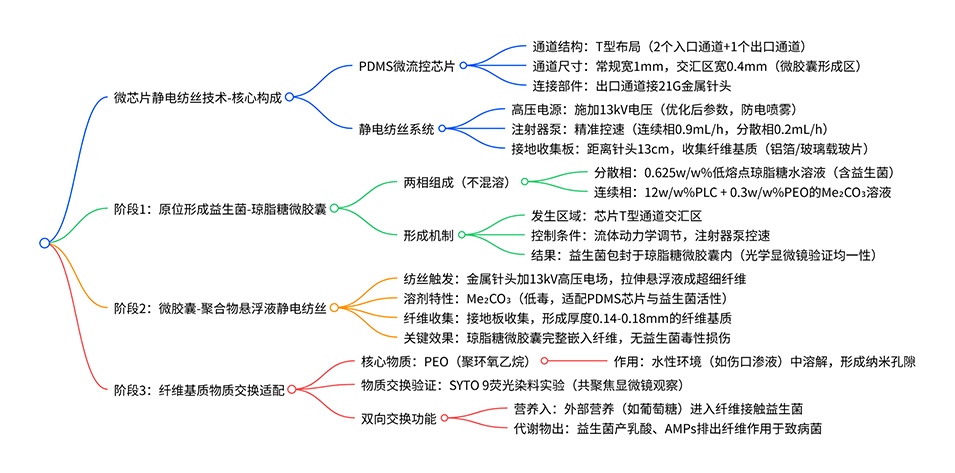 微芯片静电纺丝技术的工作原理在于将微流控芯片的精准相控能力与静电纺丝的纤维成型能力结合,通过原位形成益生菌微胶囊并直接纺入疏水纤维基质,实现活菌的高效包封、保护与递送,具体如下: