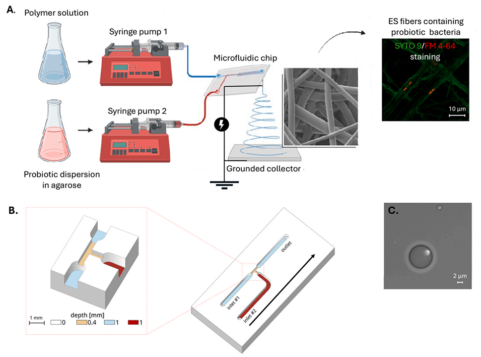 1、本研究开发了一种创新的微芯片静电纺丝技术,将微流控芯片与静电纺丝相结合,制备出含有活性益生菌的纤维基质。