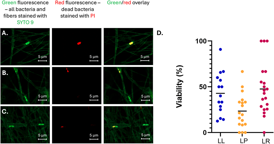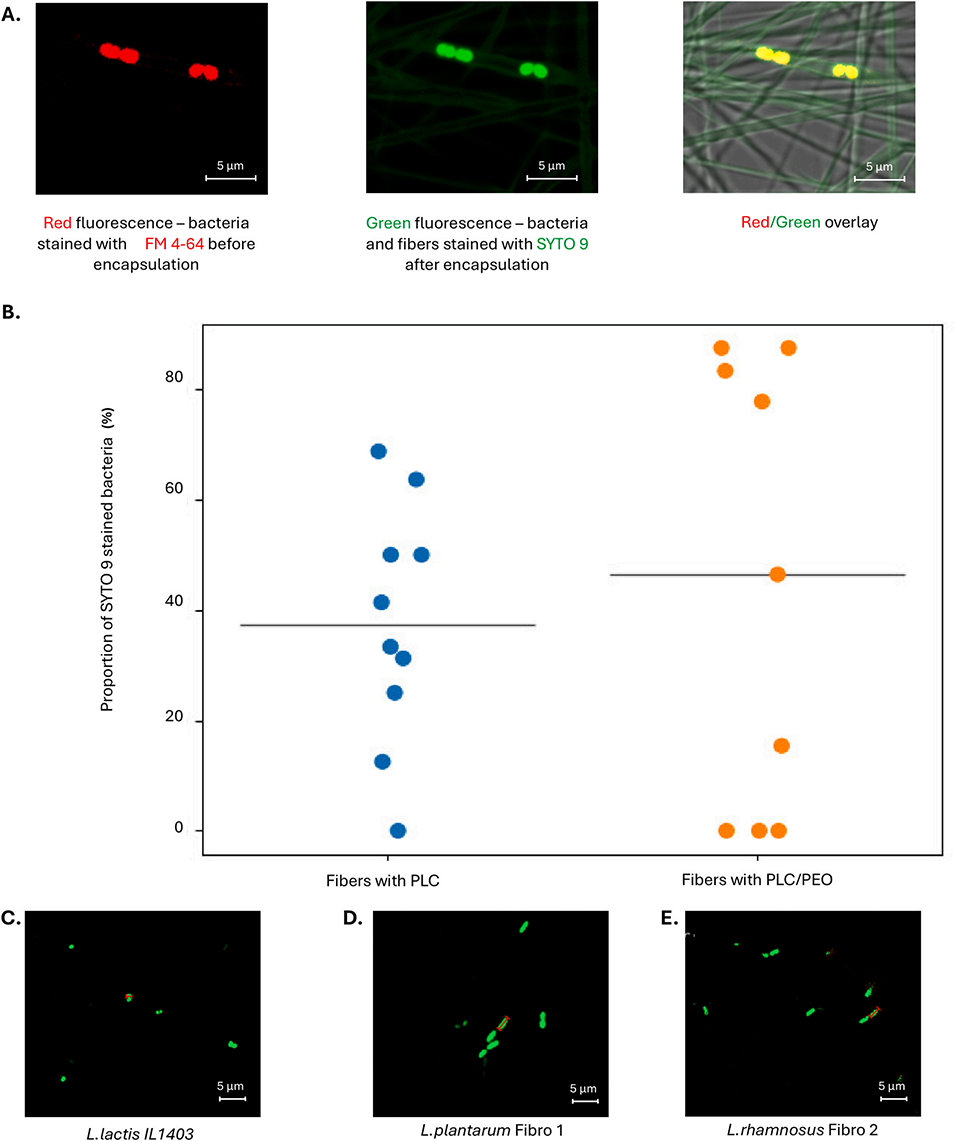 2、该方法将益生菌封装于微胶囊内,并在同一过程中将其纺入疏水性纤维。通过共聚焦显微镜和荧光染色证实益生菌存在于纤维中,在1mm厚的基质中益生菌平均浓度为 106 个细菌/cm2。