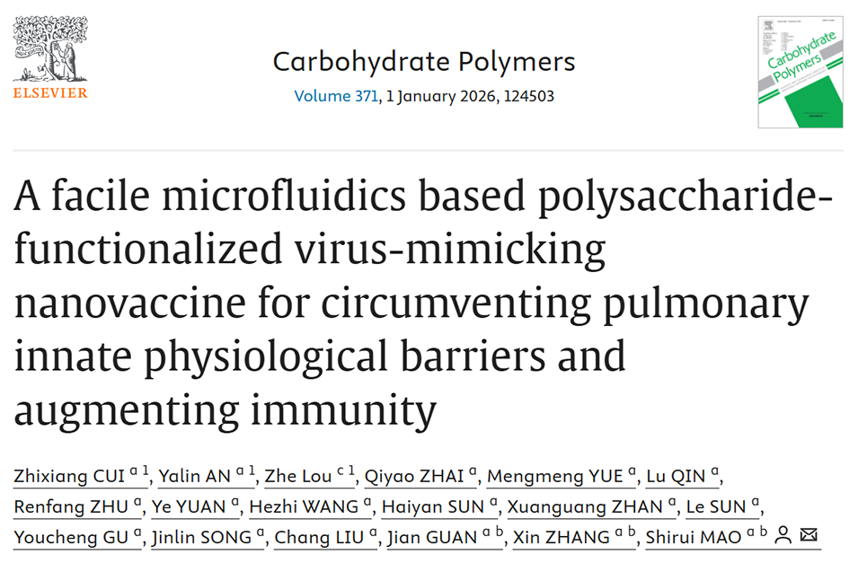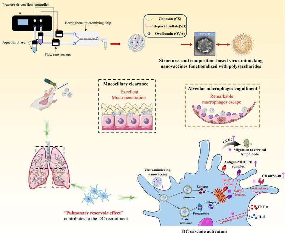 近期,COVID-19变异株与流感日益频发,使得肺部疫苗备受关注。然而,肺部固有的免疫屏障往往会显著削弱纳米疫苗的功效。此外,安全有效的吸入式佐剂之匮乏,也制约了纳米疫苗的进一步发展。近期,沈阳药科大学药学院毛世瑞教授团队采用微流控技术成功构建了一种硫酸乙酰肝素修饰的病毒模拟纳米疫苗。该制剂不仅能高效穿越肺部黏液屏障、规避巨噬细胞吞噬,还可显著增强树突状细胞募集与抗原递呈,从而激发系统性的体液免疫、细胞免疫与黏膜免疫应答。相关研究以“A facile microfluidics based polysaccharide-functionalized virus-mimicking nanovaccine for circumventing pulmonary innate physiological barriers and augmenting immunity”为题,发表在期刊《Carbohydrate Polymers》上。
