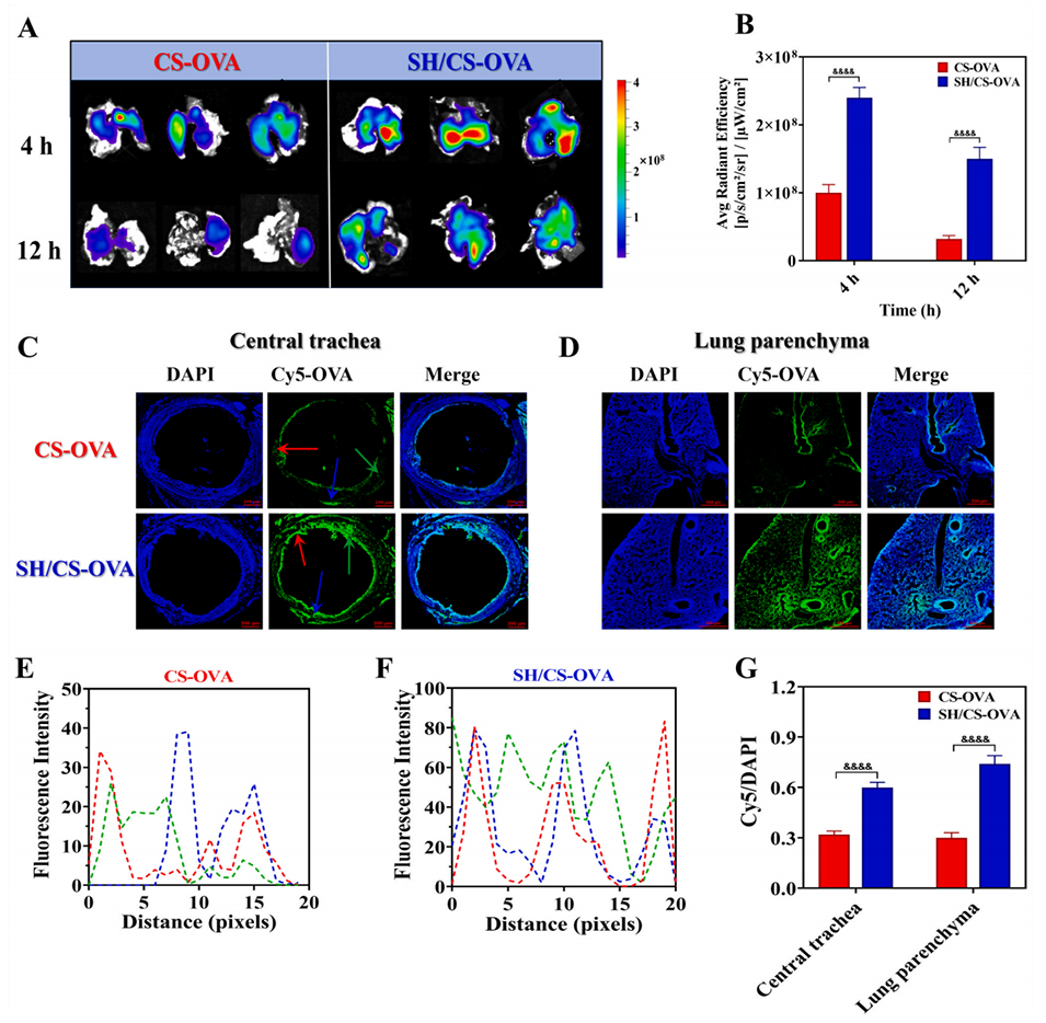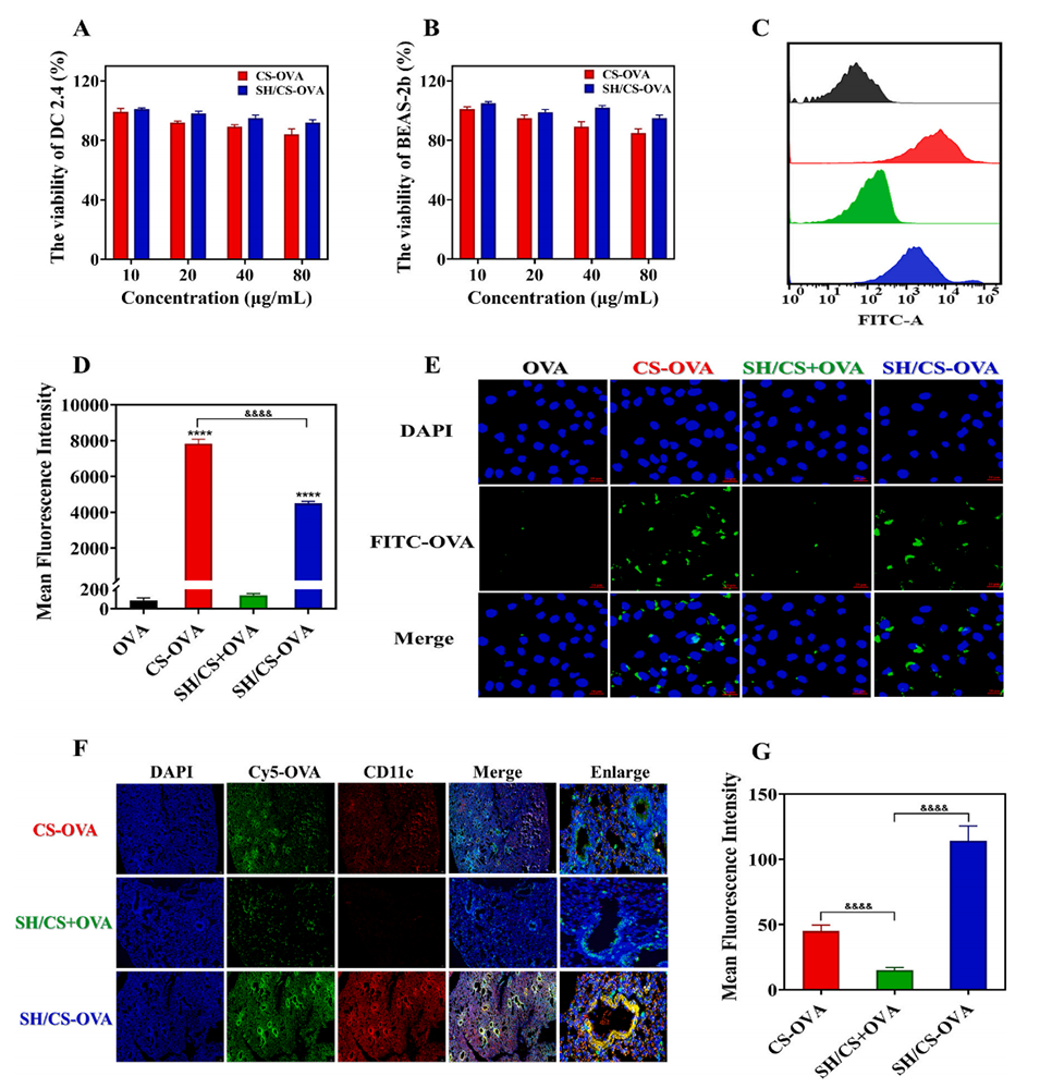 1、本研究开发了一种基于微流控技术的多糖功能化病毒模拟纳米疫苗(SH/CS-OVA),以克服肺部先天生理屏障并增强免疫应答。