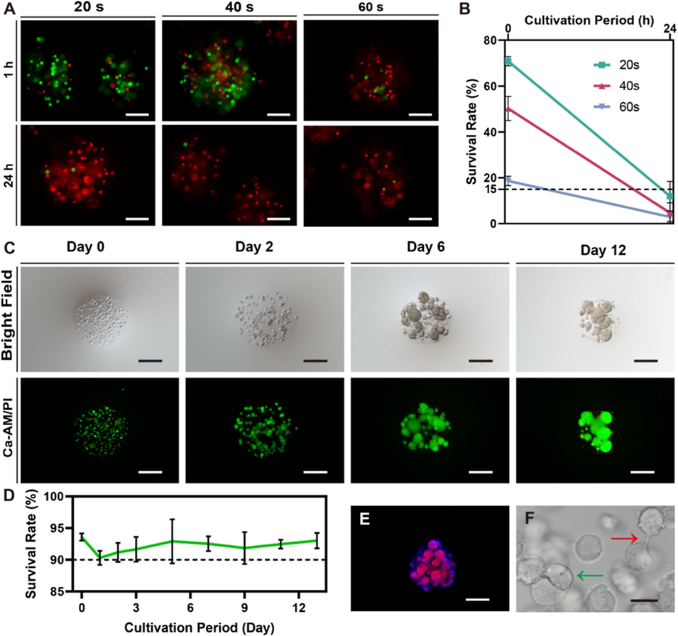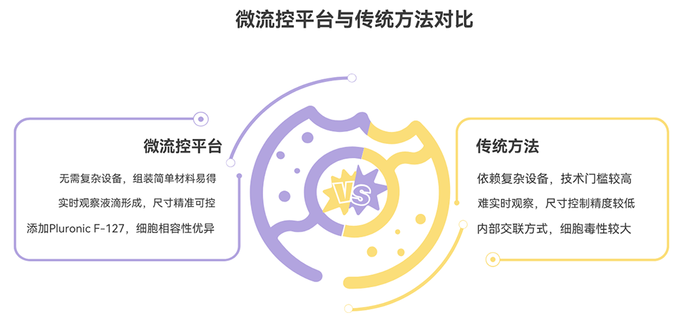 1、本研究开发了一种微流控平台,用于制备单分散、负载细胞的甲基丙烯酰化明胶(GelMA)和海藻酸钙(ALG)水凝胶微球,细胞存活率高。