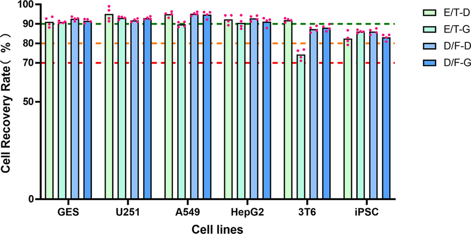 图4. 乙二醇/海藻糖(E/T,12% 乙二醇 + 4% 海藻糖)冷冻保护剂可用于单细胞悬液的冷冻保存。不同冷冻方案(-D 代表直接冷冻方案,-G 代表梯度冷冻方案)下,经 E/T 或二甲基亚砜/胎牛血清(D/F,10% 二甲基亚砜 + 10% 胎牛血清)冷冻保存的各类细胞的解冻后存活率