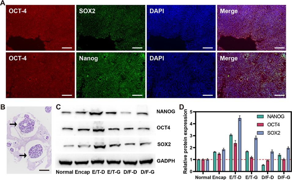 图6. 诱导多能干细胞(iPSC)微球经乙二醇/海藻糖(E/T)冷冻保存后仍保留多能性