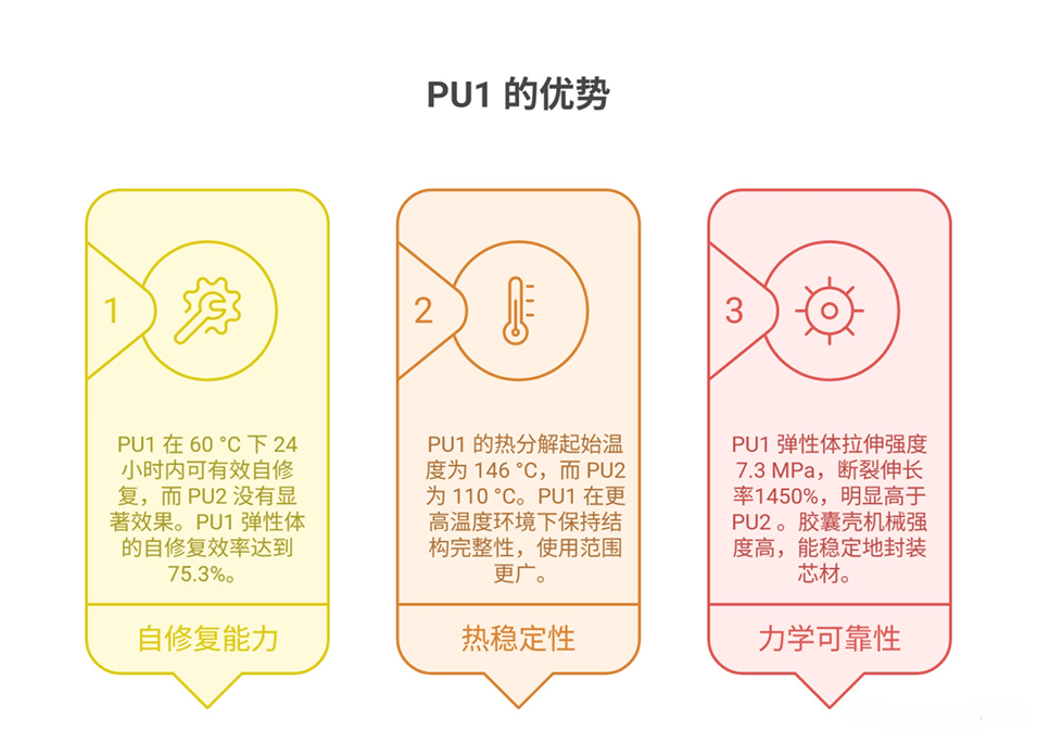 PU1微胶囊实现“形状自适应自修复”的核心机制在于动态二硫键的热力学交换反应与形状记忆效应的协同作用:当温度高于其玻璃化转变温度(Tg=−53.2 °C,如60°C)时,PU1分子链柔性提升,先通过形状记忆恢复原始形态,使受损切口自闭合;随后二硫键发生断裂-重组的链交换反应,完成结构修复。