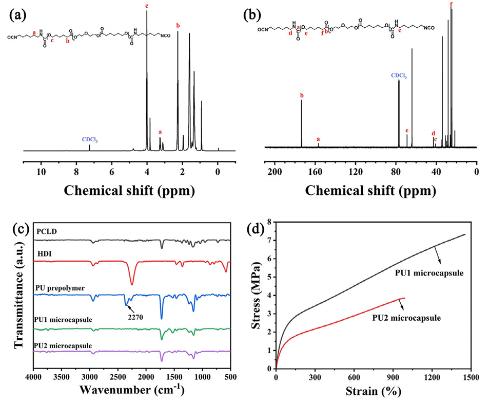 图3. a)PU预聚物的¹H NMR谱图及b)¹³C NMR谱图;c)聚己内酯二醇(PCLD)、六亚甲基二异氰酸酯(HDI)、PU预聚物及微胶囊的FTIR光谱图;d)PU1与PU2弹性体薄膜的拉伸应力-应变曲线