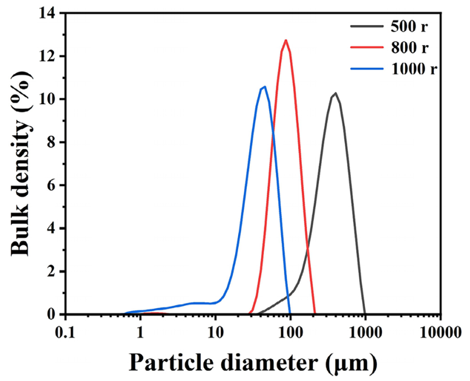 图6. 搅拌速率分别为500、800、1000 rpm时制备的PU1微胶囊粒径分布曲线