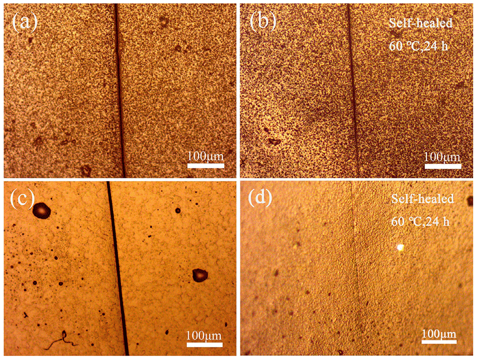 图7. a-d)PU2(a, b)与PU1(c, d)弹性体薄膜自愈前(a, c)与自愈后(b, d)的光学显微镜(OM)图