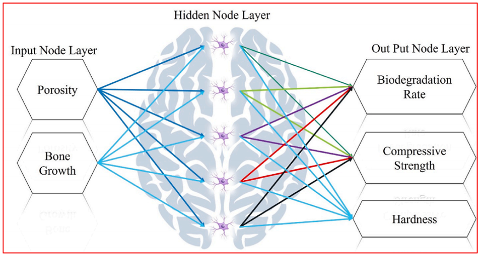 图12. 含隐藏层的人工神经网络(ANN)示意图。该网络包含一个具有5个神经元的隐藏层,以孔隙率百分比和骨生长百分比作为输入,来预测生物降解率、压缩强度和硬度。这代表了一种基于磷酸三钙组织响应的新型生物陶瓷方法。