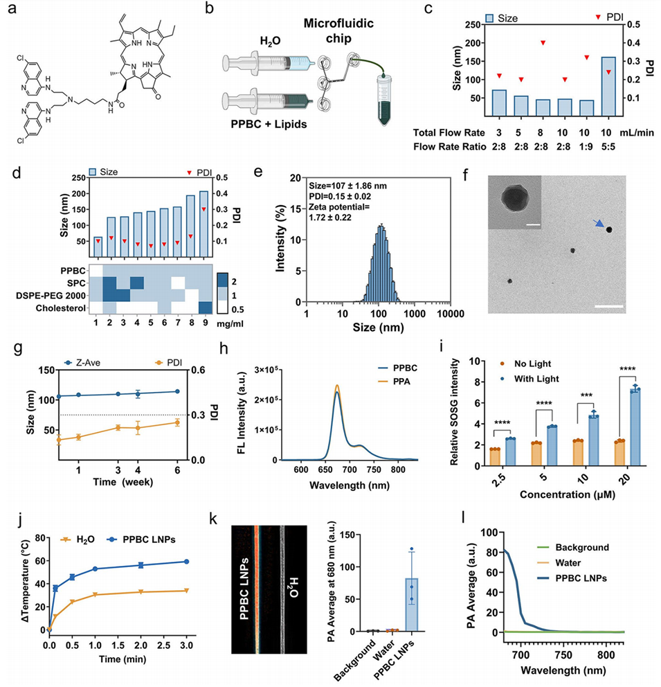 图1: PPBC LNPs的制备与表征。a: PPBC的化学结构式。b: 用于合成PPBC LNPs的微流控系统示意图。c, d: 通过调整总流速、流速比和脂质成分比例来优化纳米颗粒尺寸和PDI。e, f: 复溶后PPBC LNPs的动态光散射粒径分布图和透射电镜图,显示其球形形貌和均匀尺寸。g: 复溶后PPBC LNPs在4°C下的稳定性数据。h: PPBC和PPA的荧光光谱对比。i: 使用SOSG指示剂测量的PPBC LNPs的单线态氧产生能力。j: PPBC LNPs溶液在激光照射下的光热升温曲线。k, l: PPBC LNPs水溶液的光声信号图及其在680-820 nm波长范围内的光谱性PA振幅。