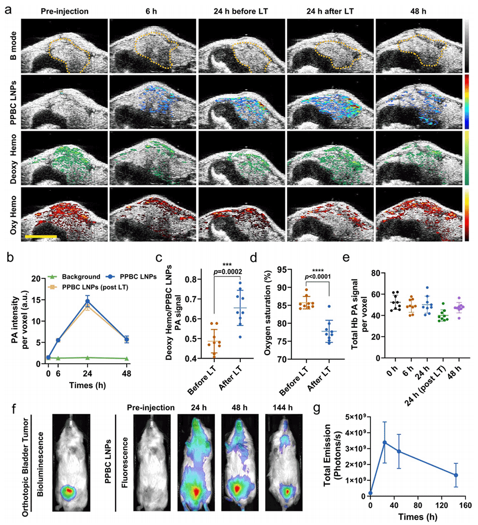 图4: 原位膀胱癌模型中的双模态成像。a: 体内PA成像随时间推移监测PPBC LNPs、脱氧血红蛋白和氧合血红蛋白的信号模式。b: 肿瘤内PPBC LNPs的PA信号定量,显示24小时达到峰值。c, d: 激光治疗前后,肿瘤内脱氧血红蛋白信号和血氧饱和度的定量分析,显示治疗后缺氧加剧。e: 肿瘤内总血红蛋白信号定量,表明其含量基本不变。f, g: 生物发光成像显示肿瘤位置,荧光成像显示PPBC LNPs在体内的分布及在肿瘤部位的长时间滞留。