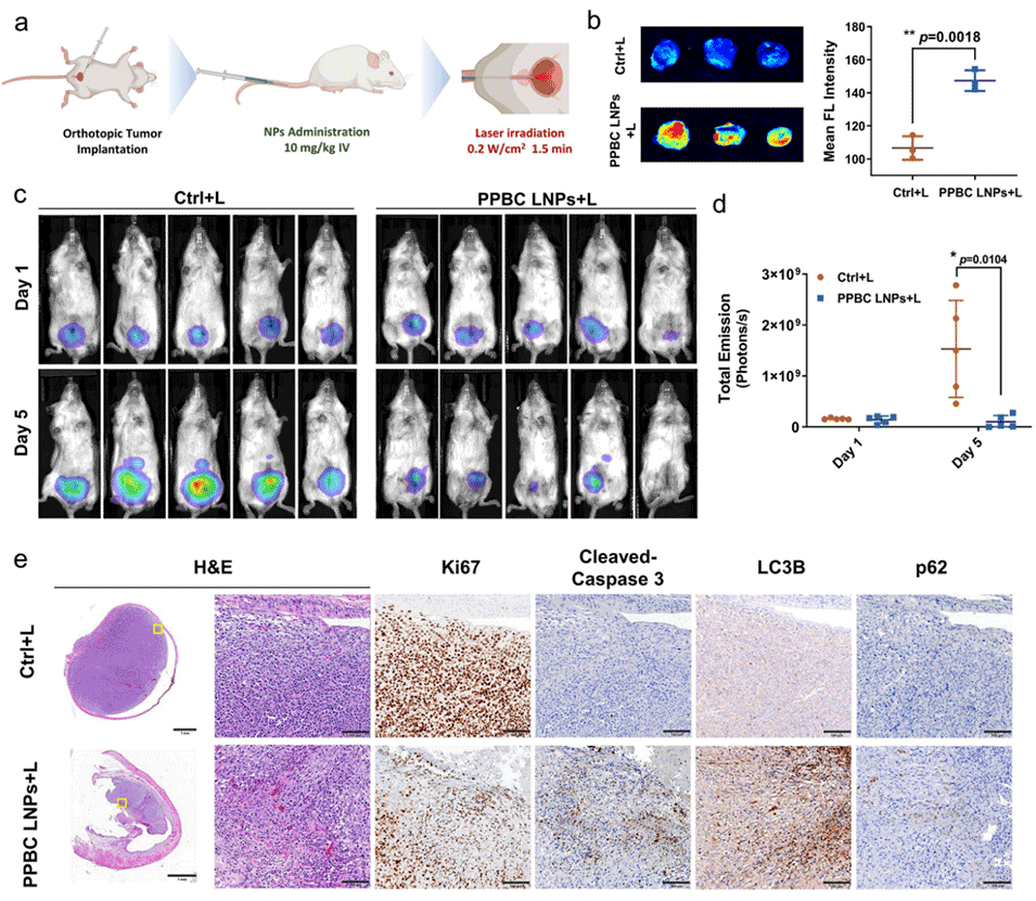 图6: 原位瘤模型中的治疗效果。a: 原位膀胱癌模型的治疗示意图。b: 离体成像及定量显示,光照后原位肿瘤内活性氧水平显著升高。c, d: 生物发光成像及定量显示,PPBC LNPs加激光治疗组肿瘤信号被显著抑制,甚至完全消融。e: 原位肿瘤组织的H&E和免疫组化染色结果与皮下模型一致,证实了治疗的有效性。