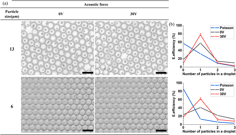 图5. 13μm和6μm粒子在不同实验条件下的液滴封装概率,实验条件包括两种声泳力生成电压(0V和30V)与五种流速(10~60μL/min)。