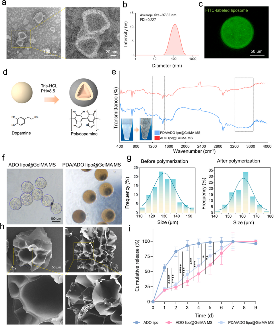 图1. 水凝胶微球的制备与表征。a)载腺苷(ADO)磷脂酰丝氨酸(PS)脂质体的透射电子显微镜(TEM)图像;b)脂质体的粒径分布;c)荧光素异硫氰酸酯(FITC)标记脂质体包封于水凝胶微球内的荧光图像;d)聚多巴胺(PDA)在甲基丙烯酰化明胶(GelMA)微球(MS)表面聚合的机制示意图;e)微球的傅里叶变换红外光谱(FTIR)图;f)微球的光学显微镜图像;g)聚多巴胺(PDA)包覆前后甲基丙烯酰化明胶(GelMA)微球的粒径分布;h)微球的扫描电子显微镜(SEM)图像;i)腺苷(ADO)的累积释放曲线(n=3)。采用双向重复测量方差分析(ANOVA)结合邦费罗尼事后检验分析时间×组间差异,*p<0.05,**p<0.01,***p<0.001,****p<0.0001。