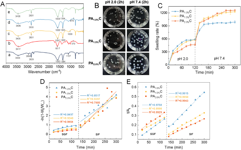 图2. PAC水凝胶微球的分子相互作用及pH响应性溶胀行为。CS(a)、UCP-Fe(III)(b)、SA(c)、PA1.5%C水凝胶微球(d)与A1.5%C水凝胶微球(e)的FTIR光谱(A)。PAC水凝胶微球在模拟胃液(SGF)与模拟肠液(SIF)中的溶胀行为:(B)微球在不同pH(2.0和7.4)模拟胃肠液中的外观变化及(C)溶胀率。PAC水凝胶微球溶胀动力学拟合曲线:(D)一级动力学拟合曲线,(E)二级动力学拟合曲线。