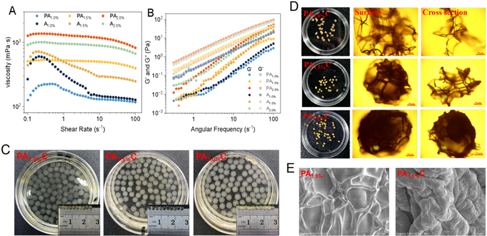 图1. SA浓度对水凝胶微球宏观形成与微观结构的影响。(A)不同浓度下,SA与UCP-Fe(III)混合体系的黏度变化。(B)不同浓度下,SA与UCP-Fe(III)混合体系的储能模量(G′)与损耗模量(G″)变化。(C)新鲜制备的PAC水凝胶微球外观。(D)冷冻干燥后PAC水凝胶微球的表面及截面光学显微镜图像(比例尺=50μm)。(E)PA1.5%与PA1.5%C冷冻干燥微球的SEM图像(放大倍数×500)。