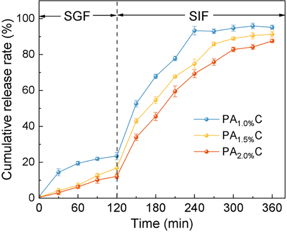图3. PAC水凝胶微球的体外模拟消化与释放行为。