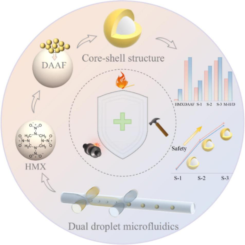鉴于此,中北大学武碧栋副教授团队首次采用双液滴微流控策略(DDMS),成功制备出壳层厚度可控的HMX@DAAF核壳微球,该材料展现出极高的安全性,其冲击感度从4 J显著提升至100 J,摩擦感度从96 N提升至360 N。相关研究以“Double-droplet microfluidic strategy for preparing spherical core–shell structured explosives: controlling shell thickness to enhance safety performance”为题目,发表于期刊《Advanced Powder Technology》。