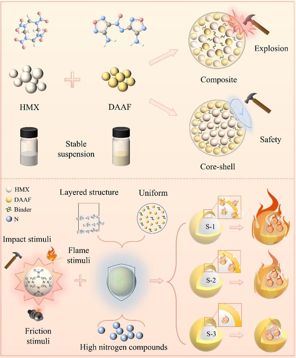 八氢-1,3,5,7-四硝基-1,3,5,7-四氮杂环辛烷(HMX)作为一种高性能炸药,密度高、爆速高,常用于导弹弹头、核武器装药和固体火箭推进剂等军事领域,但冲击敏感度仅4 J、摩擦敏感度仅96 N,受冲击或摩擦时易形成热点引发爆轰,限制了其生产、运输与应用。