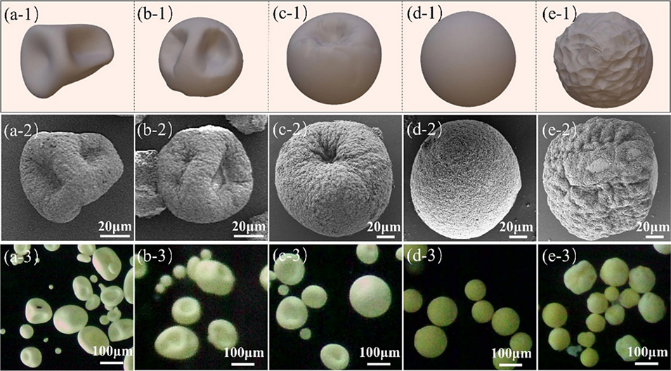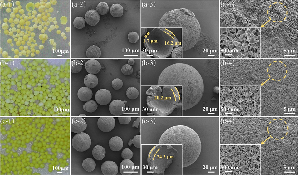 图3:不同壳浓度下制备的微球SEM图像:(a)S-1、(b)S-2、(c)S-3