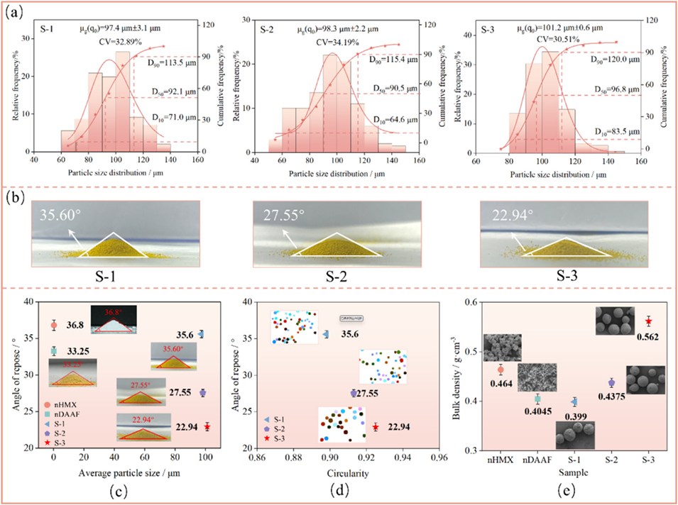 图4:(a)粒径分布;(b)S-1、S-2、S-3的休止角(AoR);(c)粒径与休止角的关系;(d)圆形度与休止角的关系;(e)休止角测试结果