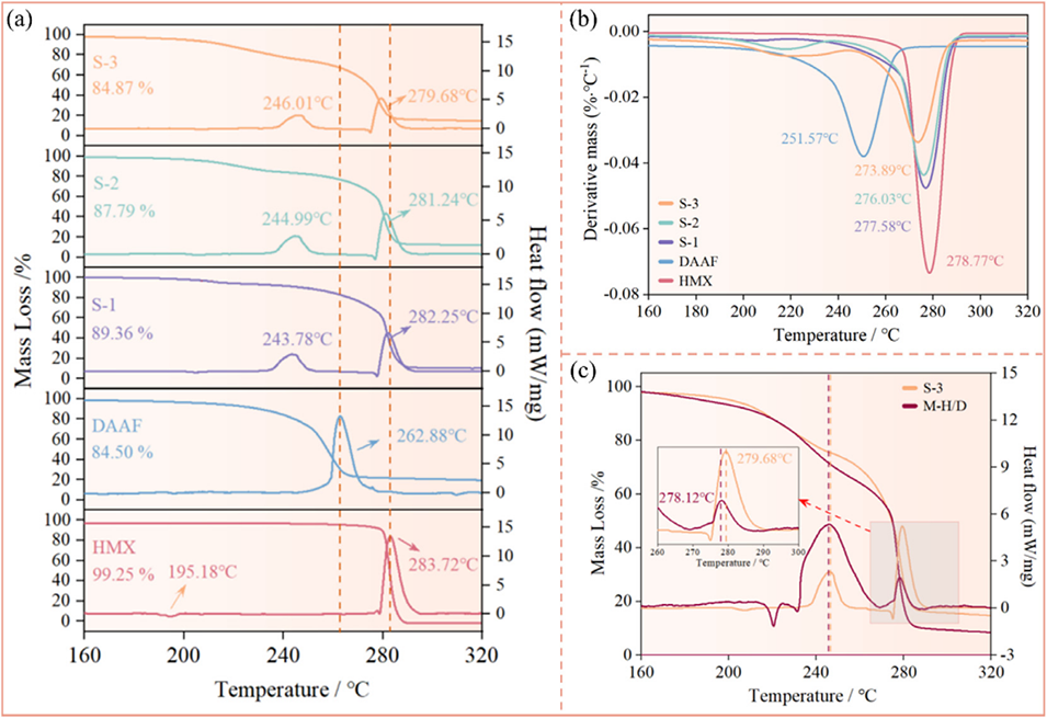 4、一系列表征结果显示,核壳微球的安全性能大幅提升(冲击敏感度从4 J提升至100 J,摩擦敏感度从96 N提升至360 N)。与混合微球相比,核壳微球在一定程度上能够延缓HMX的分解。