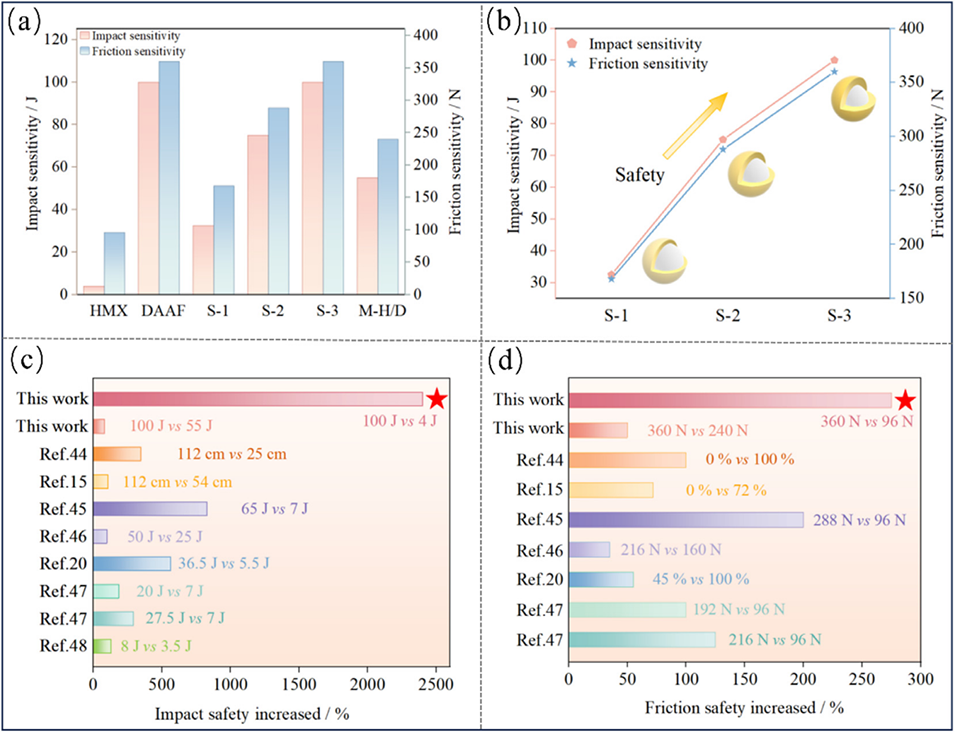 图8:(a)冲击敏感度与摩擦敏感度测试结果;(b)不同壳层厚度对安全性能的影响;(c)冲击敏感度性能对比分析;(d)摩擦敏感度性能对比分析