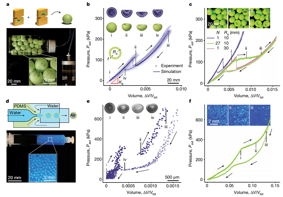 这一形变会瞬间增大胶囊的容积,吸收更多流体,从而导致整体压力突然下降。在由多个胶囊组成的悬浮液中,连续的逐个屈曲便形成了宽泛的压力平台。这使得超流体的压缩性不再是常数,而是可以被编程的。