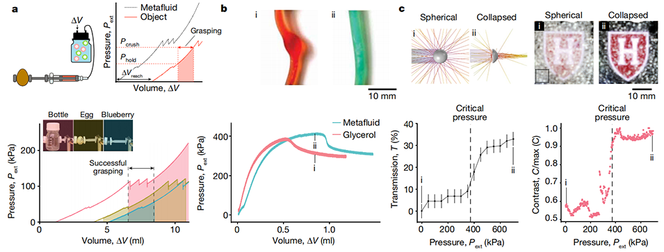 受这些最新进展的启发,哈佛大学约翰·A·保尔森工程与应用科学学院研究团队开发了一种由可变形弹性胶囊构成的超流体,并揭示其壳层在压力下的屈曲不稳定性,能赋予流体可编程的非线性力学响应、开关式光学特性与可调粘度,进而演示了其在软体机器人、智能光学元件等方面的突破性应用。相关研究以“Shell buckling for programmable metafluids”为题目,发表在期刊《Nature》上。