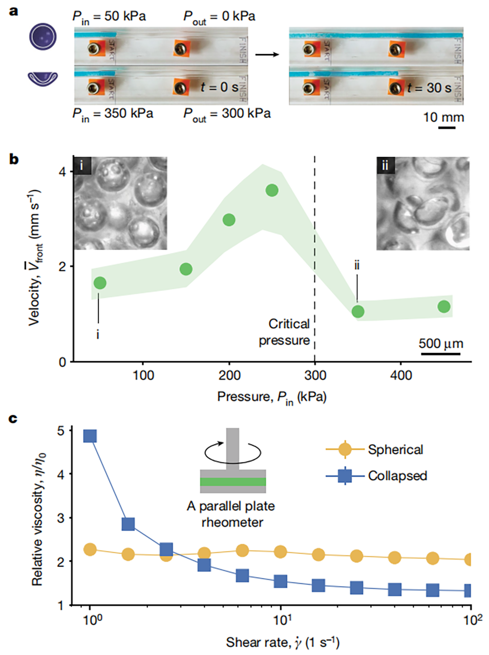 屈曲塌陷后,胶囊变成非球形的凹面结构,极易相互钩挂、形成团簇,从而显著增大流动阻力,使有效粘度大幅提升。同时,这种由团簇导致的结构在高速剪切下会被破坏,因而表现出剪切稀化的非牛顿流体特性。
