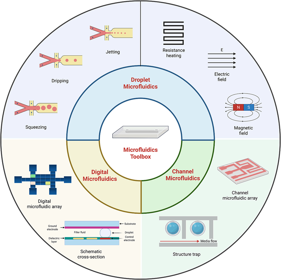 图1. 微流控工具箱。展示了被动式与主动式液滴生成方法的示意图、数字微流控结构示意图,以及采用结构陷阱用于细胞和反应相关应用的通道式微流控示意图。
