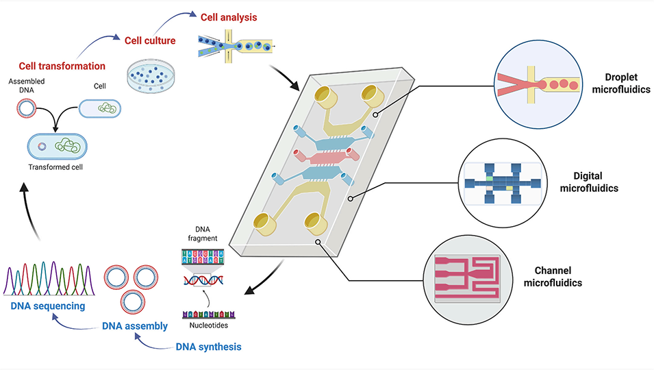 图2. 用于合成细胞应用中分子生物学与分析方法的微流控技术。菌株开发的“设计-构建-测试-学习”循环流程包括:DNA合成与组装、细胞转化、培养及表型分析。图中呈现了三类微流控技术:液滴微流控(用于细胞包裹、分析及作为独立生物反应器)、数字微流控(用于DNA合成、组装及精准液体操控)、通道式微流控(用于受限结构内的细胞培养与生化反应)。