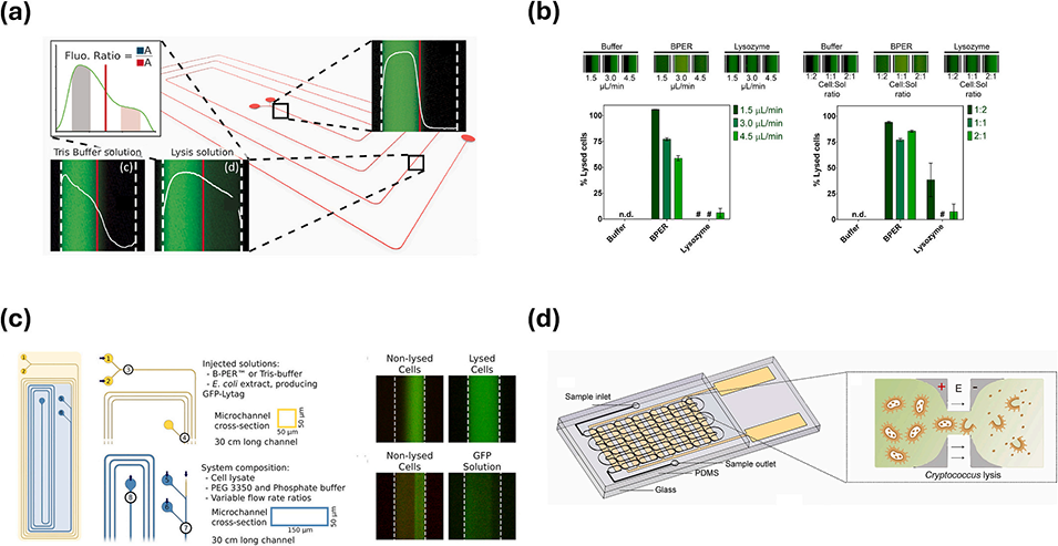 图4. 基于微流控器件的细胞裂解。(a)用于快速化学裂解筛选的微流控芯片示意图。(b)在微通道内使用三羟甲基氨基甲烷-盐酸(Tris-HCl)缓冲液、B-PER®试剂和溶菌酶裂解大肠杆菌的效率对比。(c)集成化化学细胞裂解与液液萃取模块的布局,及未裂解细胞与已裂解细胞的荧光图谱。(d)用于隐球菌快速电穿孔裂解与检测的芯片。