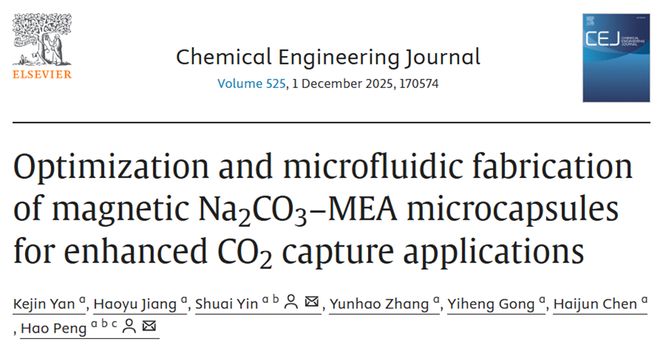 针对全球气候变化下的CO₂捕获需求,南京工业大学机械与动力工程学院彭浩教授、尹帅副教授团队通过液滴微流控技术将Na₂CO₃-MEA复合吸收剂封装于光固化有机硅壳层,开发出一种新型微胶囊碳吸附剂(MECS@Na₂CO₃-MEA),该吸附剂在优化配方与结构后,CO₂吸收速率较单一Na₂CO₃体系提升149%,且具备优异循环稳定性与低浓度CO₂捕获能力。相关研究以“Optimization and microfluidic fabrication of magnetic Na2CO3–MEA microcapsules for enhanced CO2 capture applications”为题目,发表于期刊《Chemical Engineering Journal》。