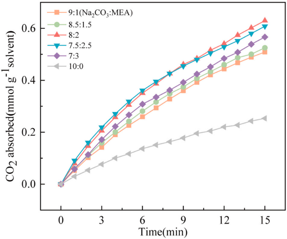 本研究中Na₂CO₃-MEA复合吸收剂的最佳配方为Na₂CO₃与MEA摩尔比=8:2时,该配方通过多目标优化函数(平衡吸收速率与材料成本)确定,性能-成本指数c达3.03,CO₂吸收速率较纯Na₂CO₃体系提升149%,为所有比例中最高。