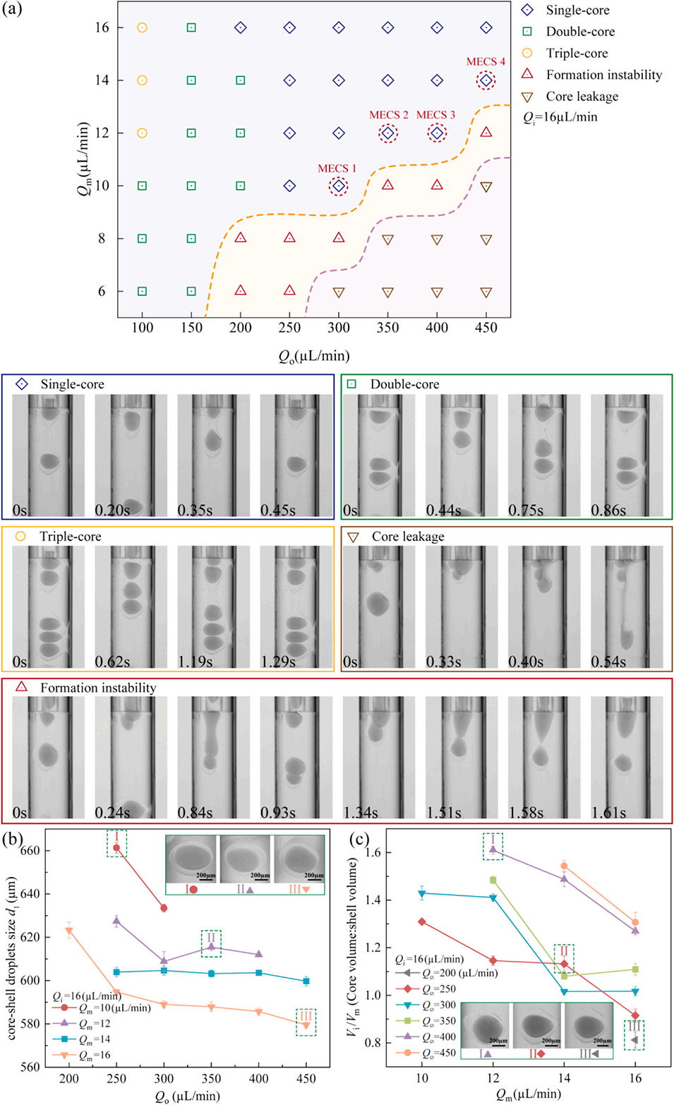 图3. 液滴生成模式图。(a)核壳复合液滴生成过程。根据生成过程将液滴形态分为五类:蓝色菱形代表单芯液滴生成过程,绿色方形代表双芯液滴生成过程,黄色圆形代表三芯液滴生成过程,棕色倒三角形代表核泄漏现象,红色正三角形代表生成不稳定现象;各类现象对应的图像展示于下方;(b)液滴总直径d₁、外相流体流速Q₀与中相流体流速Qₘ的关系图;(c)当内相流速Qᵢ=16μL/min时,核壳体积比φ(Vᵢ:Vₘ)、Q₀与Qₘ的关系图。
